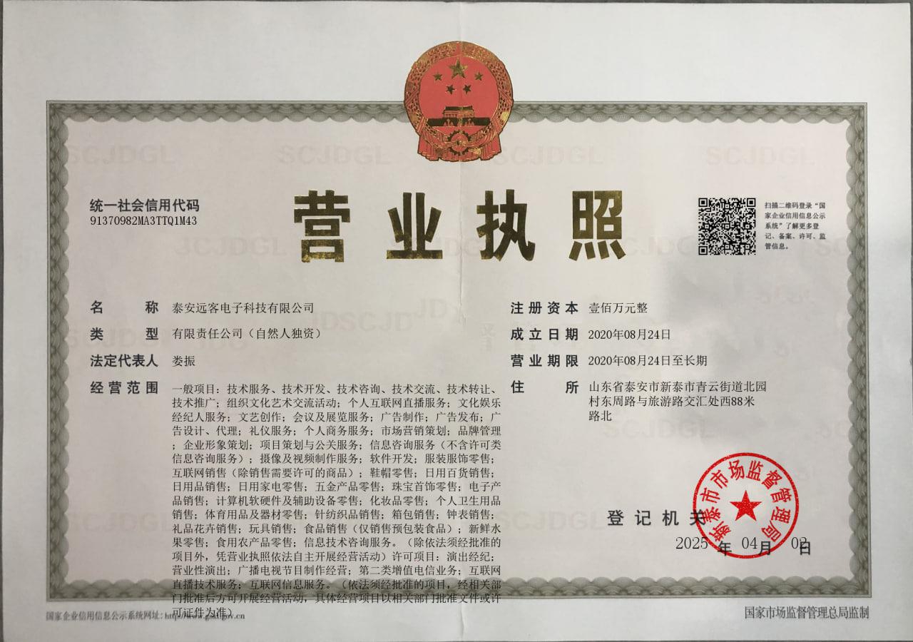 泰安遠客電子科技有限公司是一家從事技術(shù)服務(wù),技術(shù)開發(fā),技術(shù)咨詢等業(yè)務(wù)的公司,成立于2020年08月24日,公司坐落在山東省,詳細地址為:山東省泰安市新泰市青云街道北園村東周路與旅游路交匯處西88米路北;經(jīng)國家企業(yè)信用信息公示系統(tǒng)查詢得知,泰安遠客電子科技有限公司的信用代碼/稅號為91370982MA3TTQ1M43,法人是婁振,注冊資本為100.000000萬,企業(yè)的經(jīng)營范圍為:一般項目:技術(shù)服務(wù)、技術(shù)開發(fā)、技術(shù)咨詢、技術(shù)交流、技術(shù)轉(zhuǎn)讓、技術(shù)推廣;組織文化藝術(shù)交流活動;個人互聯(lián)網(wǎng)直播服務(wù);文化娛樂經(jīng)紀人服務(wù);文藝創(chuàng)作;會議及展覽服務(wù);廣告制作;廣告發(fā)布;廣告設(shè)計、代理;禮儀服務(wù);個人商務(wù)服務(wù);市場營銷策劃;品牌管理;企業(yè)形象策劃;項目策劃與公關(guān)服務(wù);信息咨詢服務(wù)(不含許可類信息咨詢服務(wù));攝像及視頻制作服務(wù);軟件開發(fā);服裝服飾零售;互聯(lián)網(wǎng)銷售(除銷售需要許可的商品);鞋帽零售;日用百貨銷售;日用品銷售;日用家電零售;五金產(chǎn)品零售;珠寶首飾零售;電子產(chǎn)品銷售;計算機軟硬件及輔助設(shè)備零售;化妝品零售;個人衛(wèi)生用品銷售;體育用品及器材零售;針紡織品銷售;箱包銷售;鐘表銷售;禮品花卉銷售;玩具銷售;食品銷售(僅銷售預(yù)包裝食品);新鮮水果零售;食用農(nóng)產(chǎn)品零售;信息技術(shù)咨詢服務(wù)。(除依法須經(jīng)批準的項目外,憑營業(yè)執(zhí)照依法自主開展經(jīng)營活動)許可項目:演出經(jīng)紀;營業(yè)性演出;廣播電視節(jié)目制作經(jīng)營;第二類增值電信業(yè)務(wù);互聯(lián)網(wǎng)直播技術(shù)服務(wù);互聯(lián)網(wǎng)信息服務(wù)。(依法須經(jīng)批準的項目,經(jīng)相關(guān)部門批準后方可開展經(jīng)營活動,具體經(jīng)營項目以相關(guān)部門批準文件或許可證件為準)